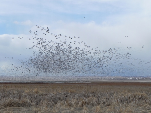 Once we got out for a walk, I started hearing the low kazoo-y sound of Trumpeter Swans. I stopped and looked around and saw at least 500 of them taking flight from a fallow field about 1/2 mile to the west. As I was looking at the Swans, I heard the growly honk of a Snow Goose- spotted about 6 of those flying over at a good altitude. Then, I looked to the South and saw thousands and thousands of ducks flying at me. Obi and I stopped and watched as flight after flight of mallards and who-knows-what-else flew just overhead and landed a few hundred yards away in a pond on private property.