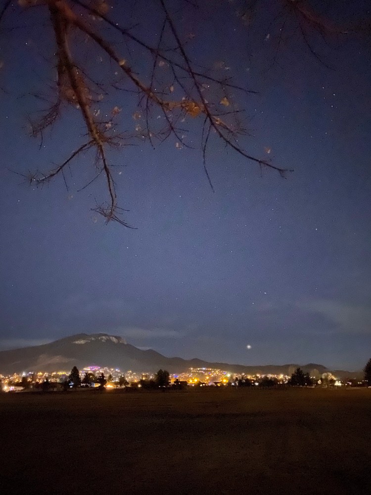 So it was that, last evening, all six of us were out in the darkness of the longest night, five us us looking up at two planets some 450 million miles apart and a minimum of 500 million miles away, and one of us chewing on a glow ball in the grass. We saw them nicely coupled up in the SW sky, just a bit west of Mt. Helena. To be honest, I liked them better yesterday when Saturn was situated more above Jupiter and it made Jupiter look like it had an upward facing flare of light. Nevertheless, it was cool to see. To the naked eye, I still saw them as two distinct points of light- but the picture from the iPhone really underscored the idea of a single bright “star”.