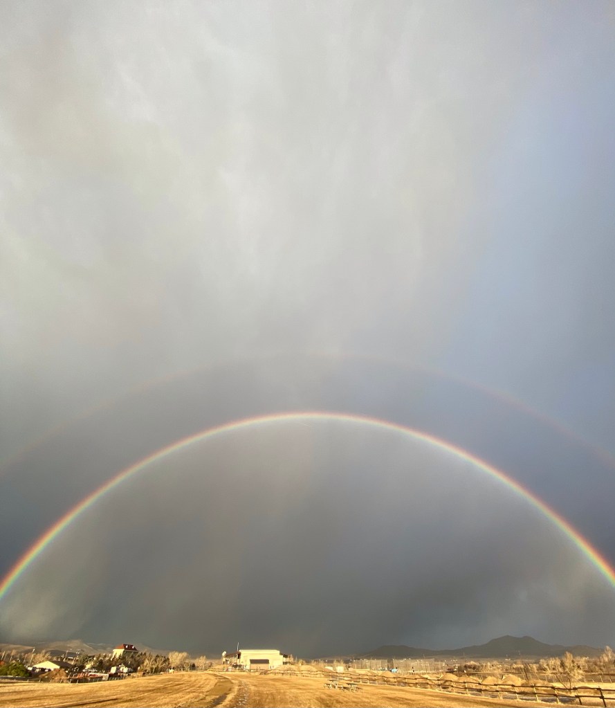 About a half mile into the walk, we noticed the sky was getting a bit dramatic off to the northwest. Then we saw a faint rainbow beginning to develop. Then we saw the second arc of the double rainbow shimmer faintly to life. About 1/4 mile later, the double rainbow took perfect form directly in front of us. The full light of the sun directly behind us, and the storm moving directly towards us combined for a very short, but very vivid full double rainbow.