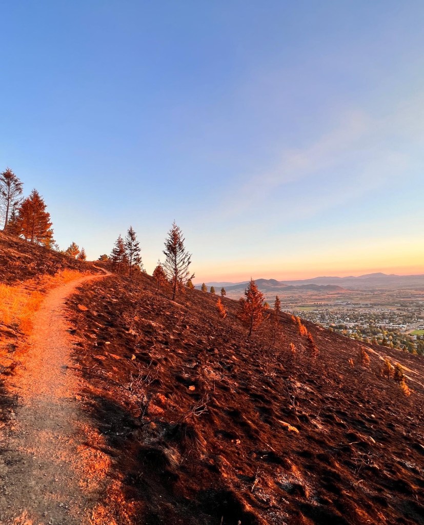 I was awake at 4:45, I was on the Prairie Trail by 6:45, and hit the 3-mile mark by 7:45. Today was the first day that people were allowed back on the trails on Mount Helena. I got up and got ready to go because I wanted to make sure I got some very early post fire pictures. I know the three or four spots that I took the pictures from, and I plan to go back to those same spots over the course of the next few months to see how secondary succession presents following this fire.