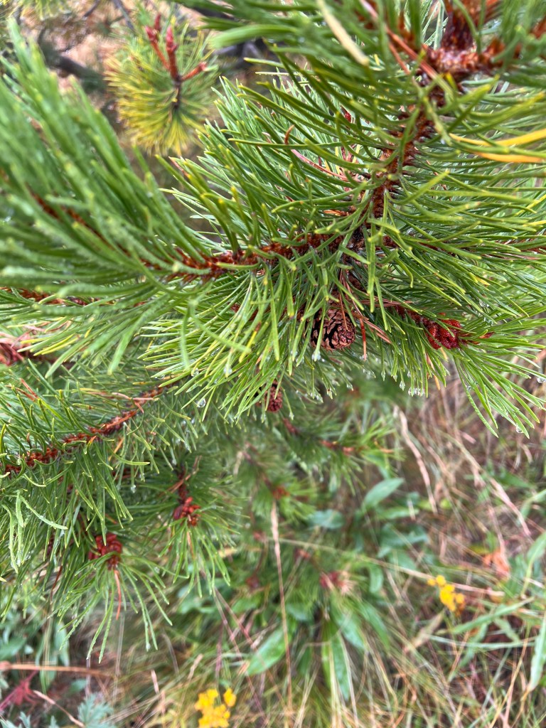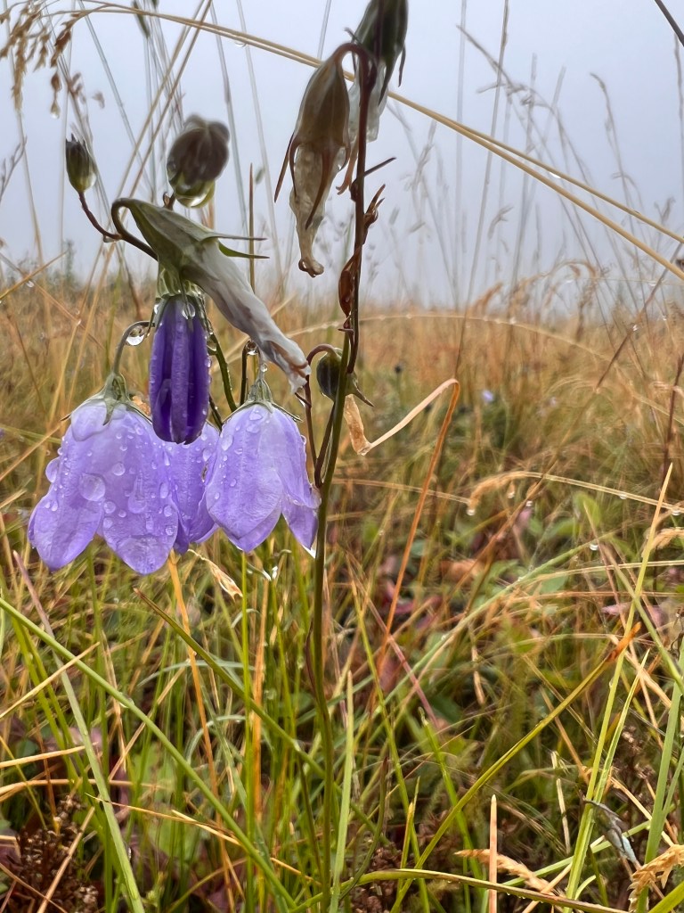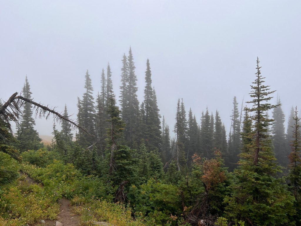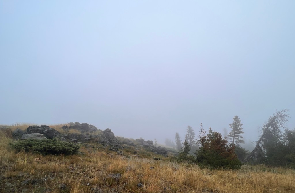 To celebrate this cooler weather, the Lab and I went up to MacDonald Pass to do a little walking in what I hoped would be an atmosphere similar to a cloud forest. We were not disappointed. It was not raining, but the upslope breeze driven mist made wearing glasses impossible; my windward side was damp after a half mile of walking; the flowers were all dripping wet; the smells were amazing; and visibility was less than 50 meters at ground level.