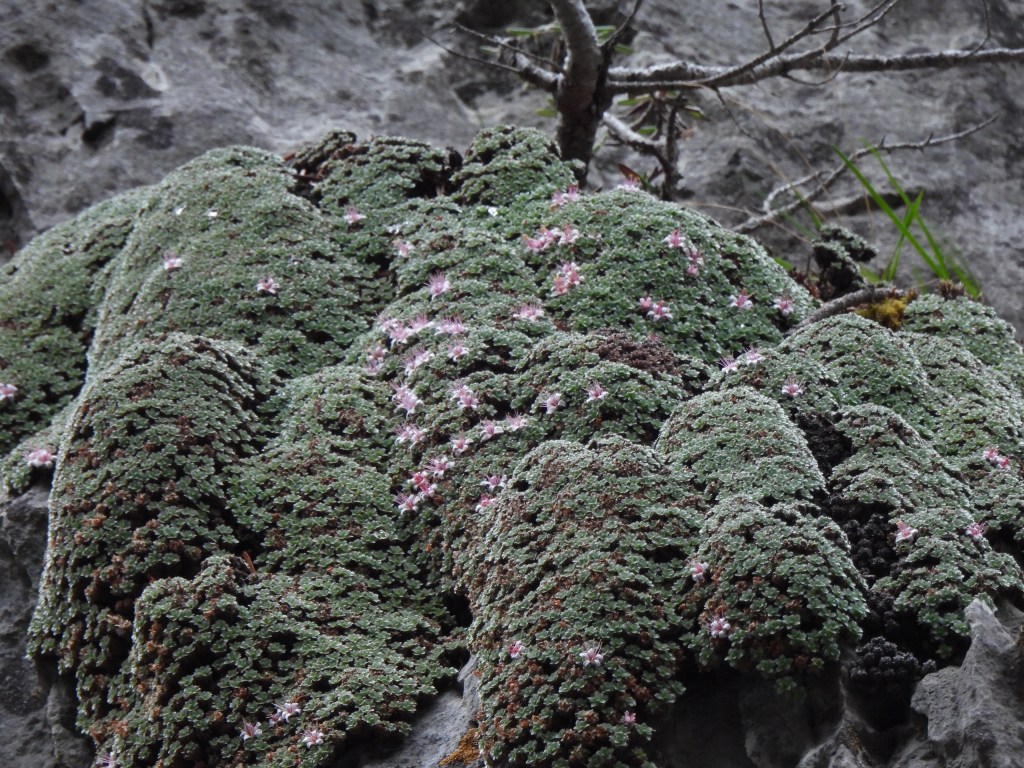 Relatively speaking, there is a lot of Kelseya up in the limestone canyons on the Belts. Hellgate and Avalanche canyons have loads of it that is visible from the road. In a few places, the dense mat of leaves is within easy reach with minimal effort. None of the easy to see/reach plants were in bloom. The really big mats are up high on the limestone and get a lot of sun compared to the plants lower down. Using binoculars and zoom lenses, we’re able to find some in bloom.
