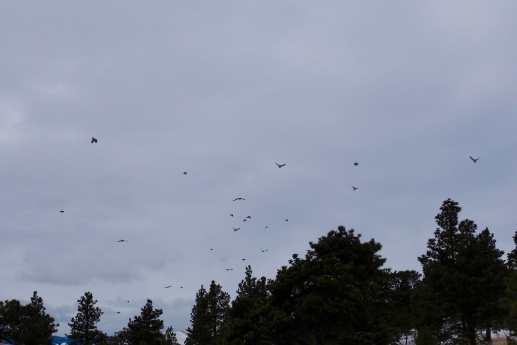 They flew over us in four waves while we just watched and listened. They looped around and came back over us so I grabbed the camera and got a quick shot of the last group of 20+ as they flew over. We followed them for a bit to try to get a good image, but they were having none of it. They kept heading southwest, away from the trailhead.