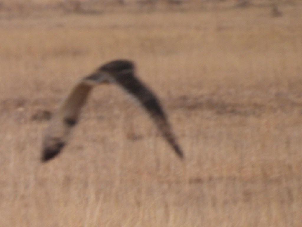We ended up seeing a Short-eared Owl – twice. Once when it spooked up and flew directly away from us (I was able to snap a couple of terrible, but diagnostic pictures), and once when it flew closer overhead being harassed by a mob of 20 Ravens and Crows. I was unable to get a picture that time, but I got a good close look with binoculars.